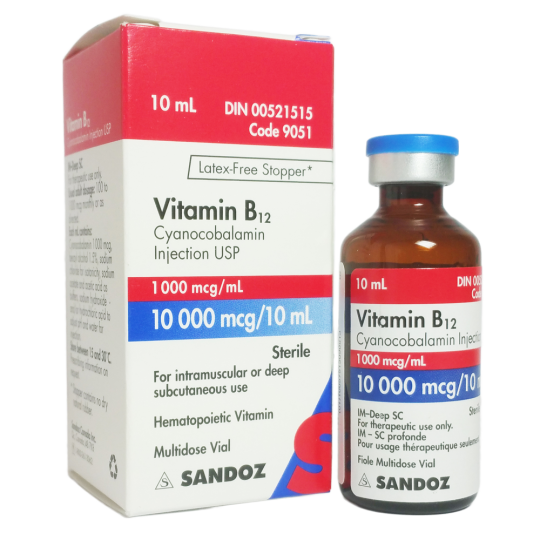Vitamin B12 (cyanocobalamin) is an essential cobalamin delivered by intramuscular injection for direct absorption bypassing the digestive system. This Pharmacy Grade vial contains 10,000 mcg in 10 mL (1,000 mcg/mL), manufactured by Sandoz/Teva. You buy injectable B12 in Canada when you want pharmaceutical-grade energy and recovery support that actually reaches your bloodstream.